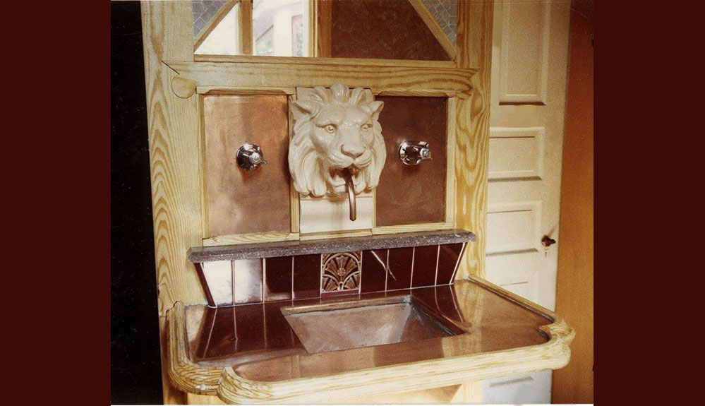 Water flowed from the lion’s head into the copper-covered sink.