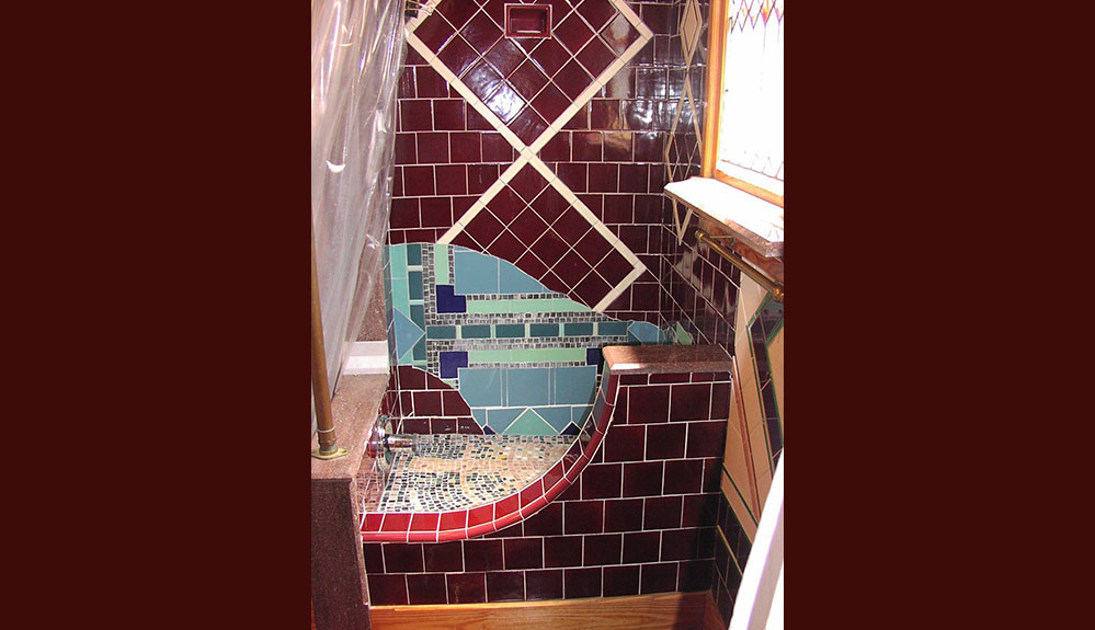The shower employed a broken tile effect, as though an earlier design was showing the newer.